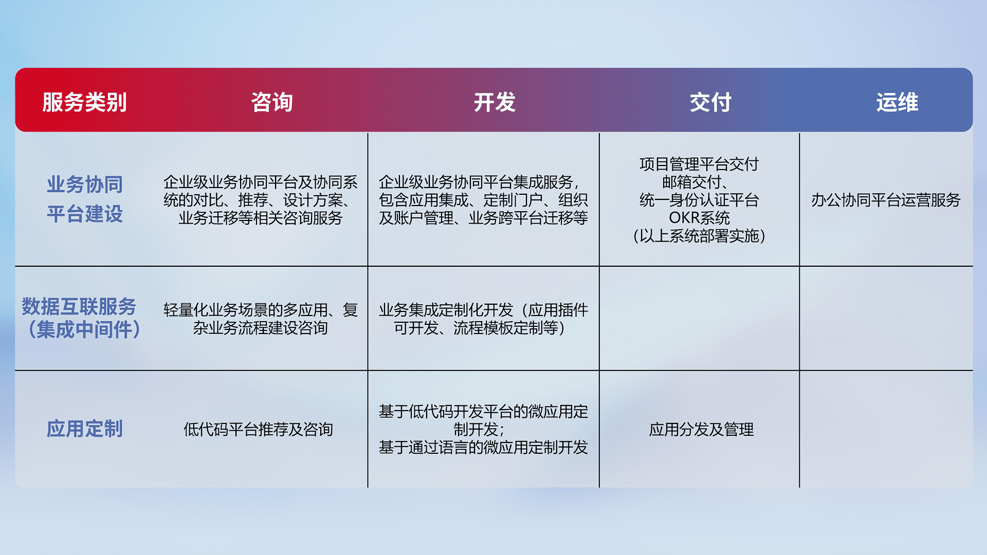针对钉钉、、、、企微、、IDaas等平台级产品提供产品的规划、、、方案、、、交付、、、定制化开发等服务,,,,实现如统一协同办公、、、智能客户服务、、混合会议管理、、智能数据查询、、、、等业务场景,,,,实现数字化转型。。。